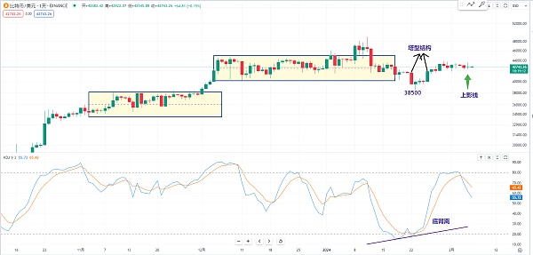 然后我们再来看一下比特币的日线 特别是在上一次38500的低点 也可以细心观察一下前面的这些低点价格是在破新低 那下方的kdj在日线级别里面是在走一个底背离 就是当时这个指标比这个指标要高