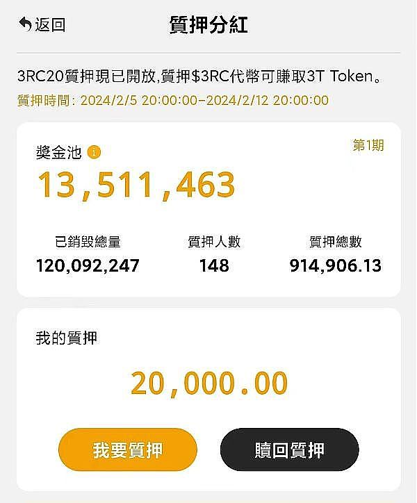 2月5日晚8点,3RC20质押功能的正式上线,众多热切期盼的3RC20持有者们纷纷涌入3T Chat,竞相参与质押,以期通过这一新机制赚取丰厚的3T分红。这一刻,3T Chat热闹非凡,也彰显了3RC20质押机制的巨大吸引力。