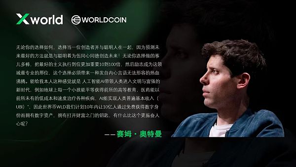 受到加密货币先驱者们的启发,X先生踏上了数字经济转型之旅。他钦佩行业巨头的战略路径——埃隆·马斯克将数字货币与主流金融融合的尝试、塞姆·奥特曼通过 Worldcoin 系统的去中心化经济愿景,并基于此,通过更人性化的支付方式Worldpay,互联网护照World ID,区块链协议Worldcoin(WLD),应用程序Worldstore,致力于以更人性化的方式参与全球经济,帮助全球10亿人支付,隐私,财富升级。
