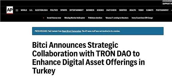 近日,土耳其顶级加密货币交易所Bitci宣布与波场TRON达成战略合作,引发全球知名媒体高度关注。国际权威媒体美联社、Benzinga等对这一合作进行了报道,报道称,双方的战略合作进一步推动波场TRON生态系统在土耳其市场的可访问性,增强了波场TRON的全球扩张。同时,这次合作加强了Bitci的服务,突出了其持续在交易所上列出优质可信数字资产的承诺。