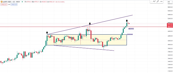 如果真的有比较大幅的回撤 我们还是可以继续布局中长线多单 那么短期我们就去观察支撑位 就是在48000附近我们先观察不能被跌破 然后还有一个很重要的中线支撑 就是这个箱体 大约是在44.4K附近
