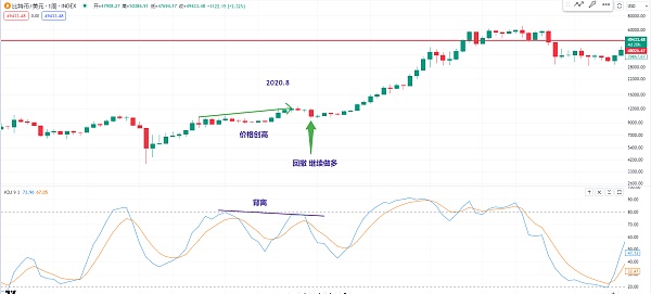 或者是我们可以再观察一下历史上比特币在2020年的8月份 也是在这个位置价格创造了前面这个价格的高点 然后下方的kdj指标是没有比前面的指标位置要高 所以指标有背离 他后面价格也是有一个回撤 有可能就是继续做多的机会