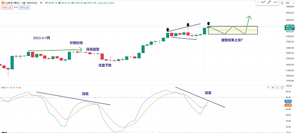 或者我们可以观察一下比特币在2023年的6月份到7月份 我们可以观察一下他这边的价格是创造了高点 就是价格在创高 然后这个位置的kdj指标他是有在背离 背离之后他也是在盘整 或者是后面如果看主力的意图 他如果要洗盘也是有可能会跌下来