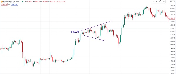 不过我们可以看一下当时比特币在2023年的1月份 当时这个位置也是有一个扩散三角的形态 他后面短期的方向是往下跌破 不过整个中长线大家还是不需要去担心