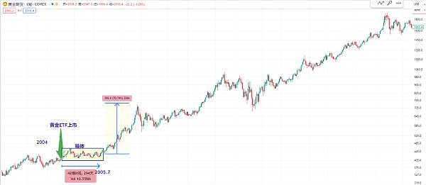 然后我们再来看一下黄金的这张图表 历史上黄金的现货ETF上市时间是在2004年左右 然后我们可以看一下从上市的时间到2005年的7月份 这个位置也是箱体 然后往上突破 到这个高点的位置是涨了接近70% 而且这一波上涨基本上是把前面几年的高点全部都突破了