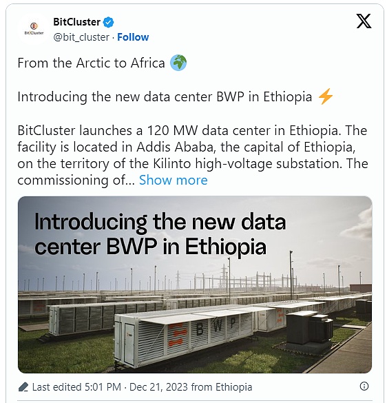 BWP 拥有由中国和其他国家矿工运营的矿机,去年年初开始向埃塞俄比亚运送设备。去年 12 月,该公司在 X 上宣布,将在首都亚的斯亚贝巴开设一个 120 兆瓦的采矿设备数据中心,即使按照德克萨斯州的标准,该数据中心的规模也相当大。