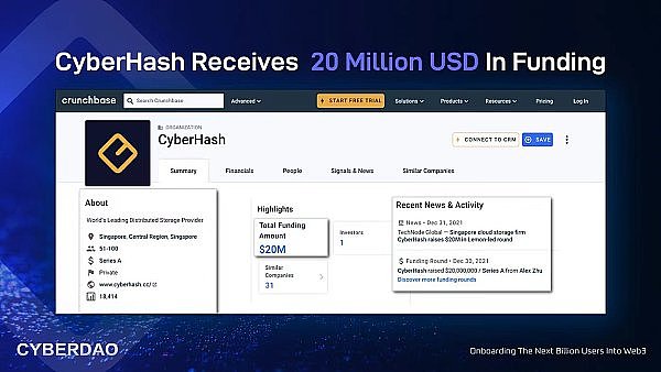 CyberDAO成立于2021年,公司主体CyberHash位于新加坡,并在创立之初获得了来自LemonCapital领投的2000万美元A轮融资。自创立以来,CyberDAO围绕技术研发、应用场景、生态激励三大方向持续推进,同时为进一步扩大组织建设,CyberDAO基于智能合约推出了POD共识机制,让用户通过参与生态建设等方式,获得以“贡献”为锚定的算力值,根据算力值来衡量每位DAO成员的身份与权益。基于公平开放的网络治理与激励机制,让组织成员的价值回报与生态繁荣形成相互促进。