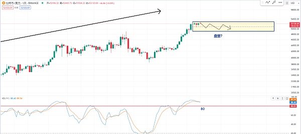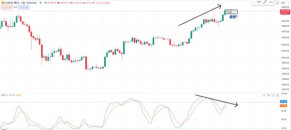 然后我们再来看一下比特币日线级别 我们先看一下比特币当前的位置短期到底会不会继续往上突破 如果不突破的话我们就要去留意下方的KDJ指标 KD可不能回到80之内 如果回到了80下方的话 有可能就会有中线的整理 所以在这个位置我们先观察他是不是在这个位置盘整