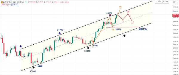 然后我们可以观察一下比特币在31000的这个高点 上一次49000的时候打到这里是有一个压力 那短期来到这个位置最近为什么告诉大家要小心 特别是中长线做多这 因为按照以往的历史经验 通道有可能会呈平行的结构