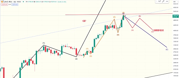 或者是我们也可以观察一下 如果这个位置是一个五浪的结构 那目前的比特币会不会在这个位置走出一个ABC 我的观点是我们也要有两手准备 去防止这个位置有没有可能是三浪里面的一浪