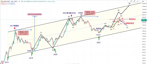 同样我们也可以观察一下从最高点跌到2019年的底部 他的时间也是跌了50根K线左右 或者是从69000的高点跌到15000的低点 时间也是跌了50根K线左右 就是比特币的底部 或者是2019年他走了一波五浪的上涨 而且从底部3000美元左右涨到69000 大约涨了21倍