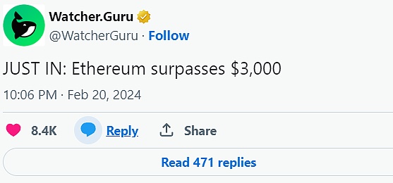 周二,以太坊(ETH),按市值排名第二的加密货币,触及了自2022年4月以来的最高水平。以太坊的本地加密货币短暂突破了3,000美元,但很快面临价格回调。