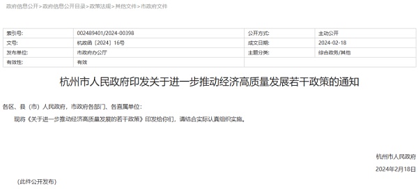 据杭州市人民政府官网2月19日发布的信息,杭州市人民政府印发关于进一步推动经济高质量发展若干政策。其中提出,推动《杭州市政府投资项目管理条例》出台。落实省扩大有效投资“千项万亿”工程,2024年,抓好省“千项万亿”重大项目120个左右,完成投资800亿元以上;推进市重点项目800个左右,完成投资2200亿元以上,带动固定资产投资增长3%。