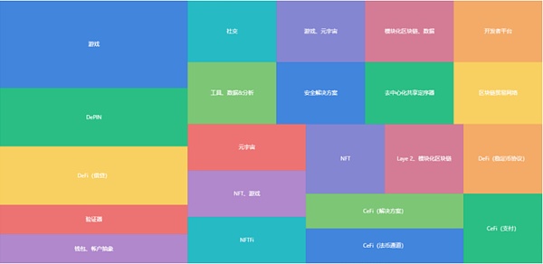 涵盖CeFi(解决方案、支付、)、游戏、元宇宙、去中心化共享定序器、开发者平台、DeFi(借贷、稳定币协议)、模块化区块链、NFTFi、DePIN、工具、社交、Layer2、钱包等赛道。