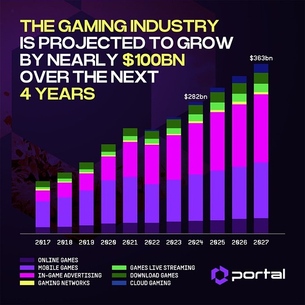 ⌜未来 4 年游戏产业将增长近 1000 亿美元。Portal 通过将最好的区块链游戏与主流受众联系起来,将 Web3 置于这一增长周期的核心⌟