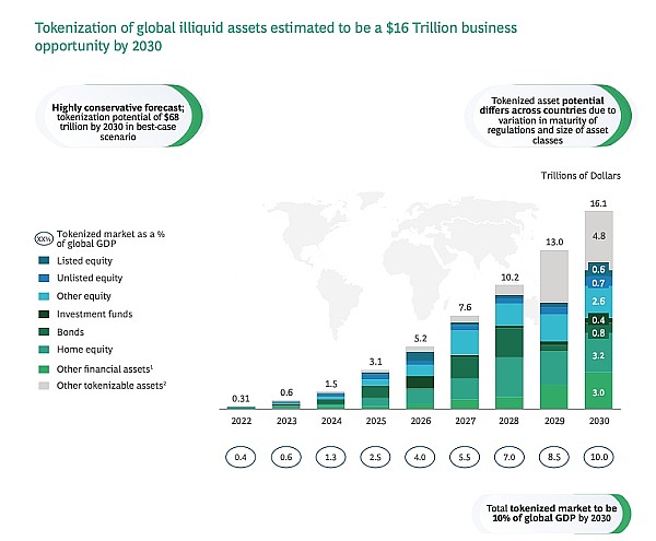 在波士顿咨询集团最近的一份报告显示,到2030年,RWA预计将成为一个规模达16万亿美元的市场。当前加密货币市场总市值约1.65万亿美元,就意味着就RWA赛道的发展就有可能为加密货币市场带来10倍的市值增长。