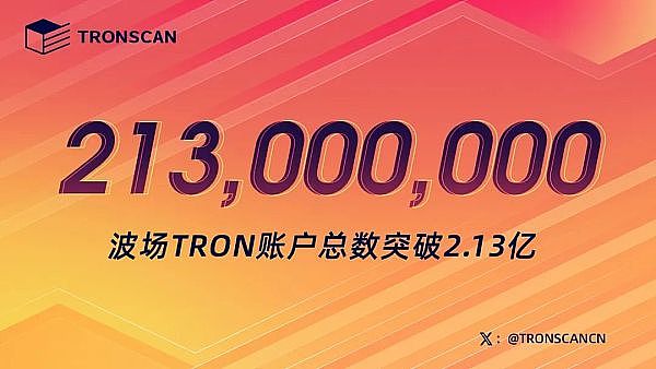 区块链浏览器TRONSCAN最新数据显示,截至2024年2月21日,波场TRON账户总数达到213,004,913,正式突破2.13亿。