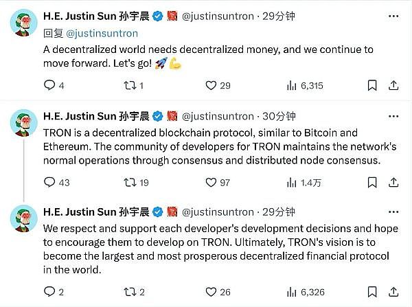 孙宇晨强调,一个去中心化的世界需要去中心化的货币。波场开发者社区通过共识和分布式节点来维护网络的正常运行,波场TRON尊重并支持每位开发者的开发决定,并鼓励他们基于波场网络进行开发。