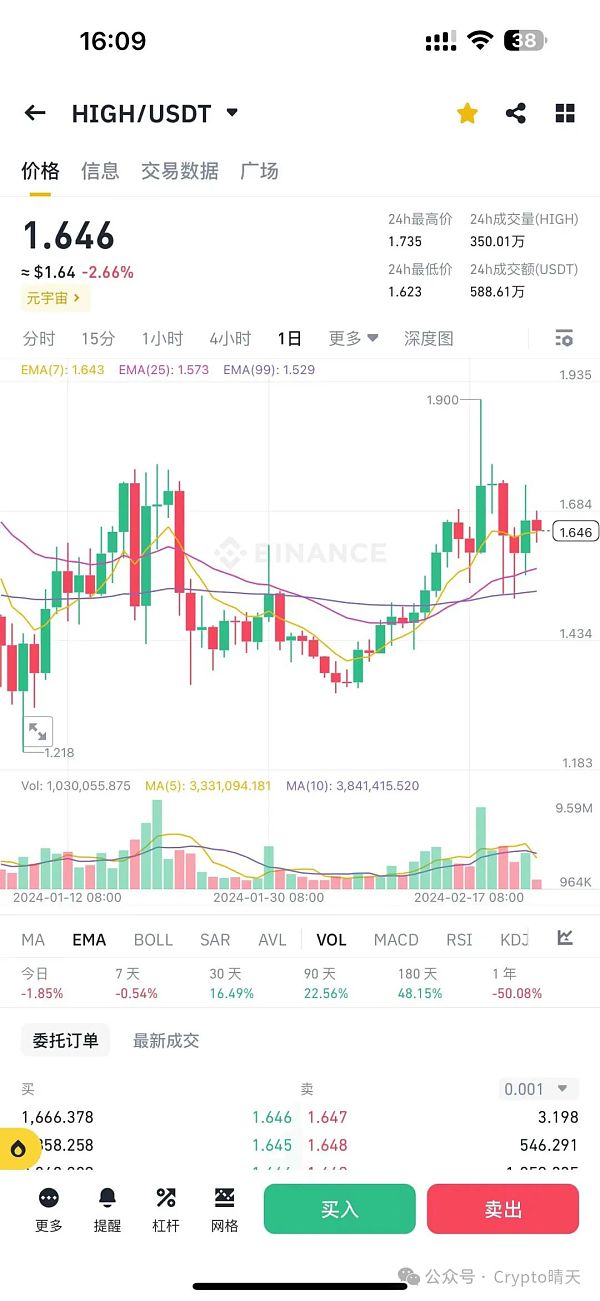 今天给大家分享的潜力币是$high,同属于币安游戏、元宇宙项目、vR赛道。目前还没有经历过牛市,未来上升空间很大,按照市场逻辑分析,上升空间大概率在5-10倍附近。是牛市最有潜力的之一,可以在1.5附近分批次介入,等待爆发!