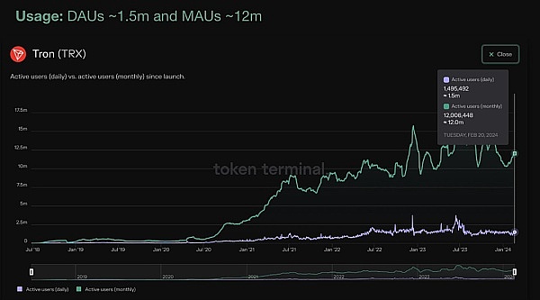 Token Terminal:波场TRON日活跃用户达150万