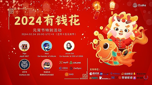 为了庆祝中国传统节日-元宵佳节,Ctalks携手JoyID、UXLINK Protocol、CESS (Cumulus Encrypted Storage System)、OwlSync、思想铭文SXIO、共同举办线上活动,为web3的朋友送上祝福和红包,希望2024好运常伴,牛市大展宏图。