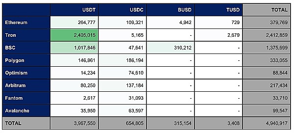从结果上看,以稳定币赛道的竞争为参考,波场版稳定币(TRC20-USDT)的市场表现令人印象深刻。数据显示,目前基于波场发行USDT突破510亿美元,USDT账户持有数超3818万。根据2023年大型对冲基金BREVAN HOWARD发布报告,波场每周有超过240万个与稳定币交互的活跃地址,超越以太坊以及基于以太坊构建的Layer 2,如Optimism和Arbitrum。
