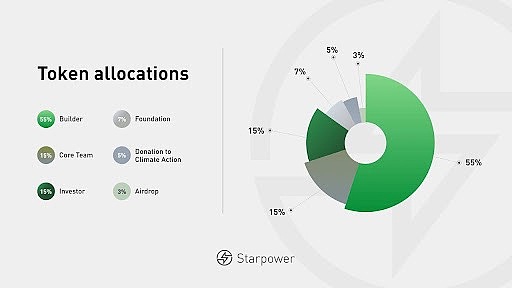 在代币的分配上,15% 将分配给核心团队,15% 将分配给投资人,7% 将分配给基金会,5% 将捐赠给研究气候变化和推动可持续发展的非盈利组织,3% 将进行空投,剩余 55% 将分配给对 Starpower 建立的网络有贡献的建设者。