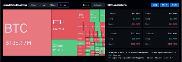 据Coinglass 数据显示,在过去24 小时,加密货币全网爆仓金额累计突破2.85 亿美元,其中有超过2.1 亿美元空投仓位遭清算,共75,154 名投资者遭清算。