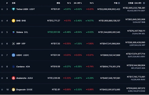CoinMarkeCap 数据显示,前十大币种近24 小时同样普涨,SOL 涨幅最大达6.54%,其他代币如:BNB、ADA、AVAX 也分别有3~5% 的涨幅。