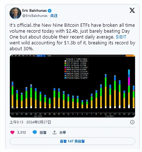 在比特币强劲拉高的背景下,彭博ETF 分析师Eric Balchunas 稍早发文表示,截至周一美股收盘,除去GBTC 外的九支新现货比特币ETF 日成交量达24 亿美元,击败首日纪录,再创历史新高。