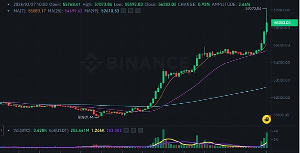 10:00更新》BTC 突破57,000 美元,近24 小时上涨近10%。
