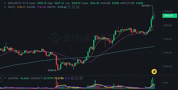 10:00更新》ETH 冲高至3,270 美元,近24 小时上涨近4.6%。