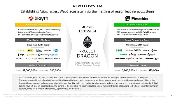 2024年2月16日,Klaytn 和 Finschia 两大区块链平台宣布合并成统一的主网,也就是 Project Dragon。Project Dragon 的目标是通过将两个生态系统和资产进行有机的结合,打造一个亚洲巨型区块链,引领 Web3 市场在亚洲的增长。合并后的新链将和 Ethereum 和 Cosmos 兼容,现有的 KLAY 和 FNSA 将被一个统一的代币取代。