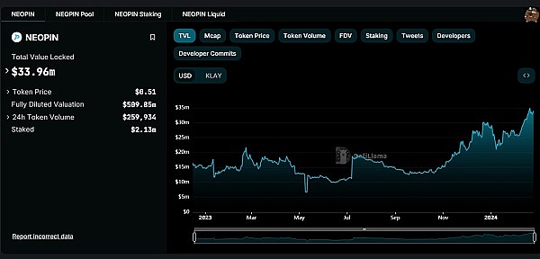 Neopin 最近更新了路线图,推出了 Finschia Bridge,EVM Bridge 新增 USDT 支持,并推出了新的流动性池,TVL 一直保持增长趋势,并在最近一个月实现了30%的增长。