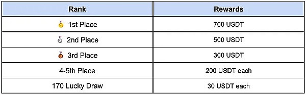 交易额最高的前五名分别获得 700USDT、500USDT、300USDT、200USDT