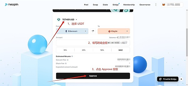 如下图所示,1/ 选择 USDT;2/ 填写跨链金额;3/ 点击 Approve。