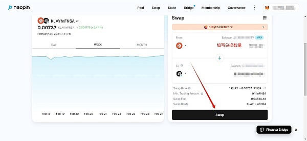 使用 KLAY 兑换 nFNSA,或者使用 nFNSA 换成 KLAY 都可以,填写兑换数量,点击 Swap。nFNSA 需要多一个授权的步骤,授权成功后Swap。