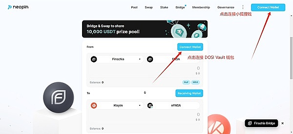 在 DOSI Vault 钱包中准备足够的 FNSA,点击页面顶部的 Bridge,选择 Finschia Bridge