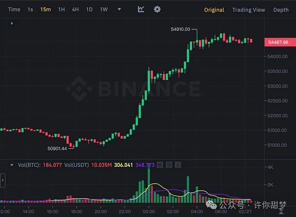 比特币自昨日深夜突破5.2 万以后,再次展现强劲涨势,今(27)日清晨四点更是一度触及54,910 美元,再度刷新今年新高纪录。截稿前,BTC 在高点震荡暂报54,487 美元、近24 小时上涨5.46%。