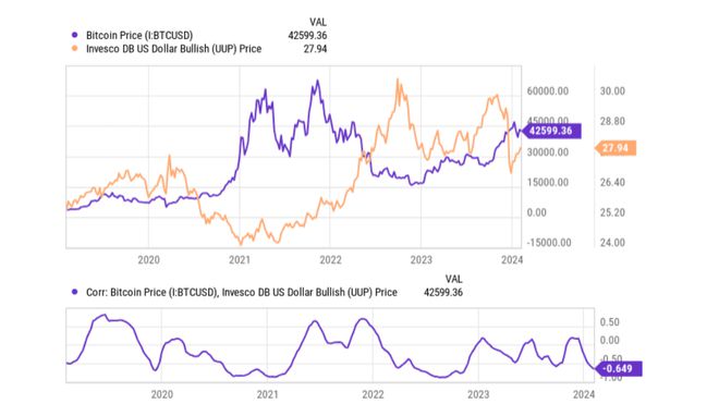 统计数据显示,周一和周二美元交易走低,与比特币呈反比关系。比特币和美元指数之间的相关性略低于-0.65,这表明当美元贬值时,比特币的价值可能会上涨,反之亦然。