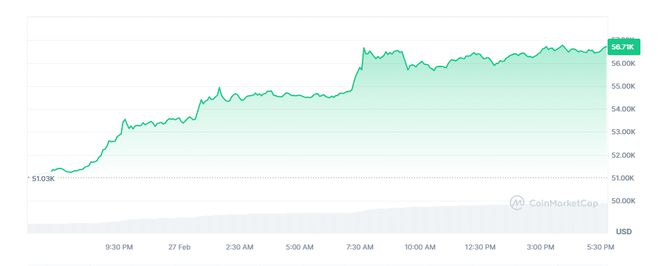 比特币在 5 万美元左右徘徊数周后,于 2 月 27 日达到 57,000 美元的价值大关。这是它最近达到的历史高点 65,000 美元,预计这次会突破这个高度。比特币价格一天内飙升超过 11%,在撰写本文时交易价格为 56,706.75 美元。交易量也是如此,增长了209%以上。