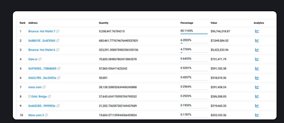 ACE代币主要分布在BSC链和Endurance主网上。 BscScan目前可追踪10,971,626个代币,其中币安地址约占90%,第二大持币地址0x880持有约6.2%的代币。