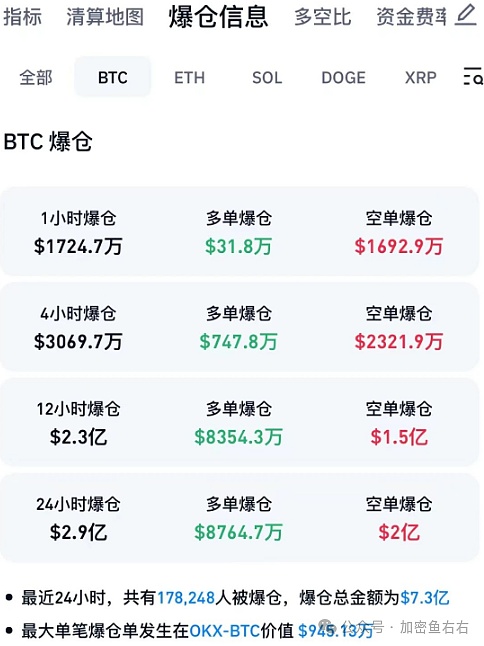 CoinGlass数据显示,最近24个小时内,比特币市场有超过17.8万人被爆仓,爆仓总金额7.3亿美元(合人民币超52亿元)。