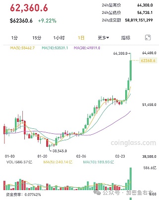 比特币盘中巨震,一度突破64000美元,日内最大涨幅达13%,刷新2021年11月以来新高;