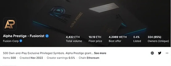 Alpha Prestige 是一种中心化奖励系统,也是一组NFT,Alpha Prestige NFT 的总供应量固定为 500 个,在Fusionist游戏中拥有多种权利,其所有者可以获得大量游戏内的福利,包括参与 Beta 测试、空投、优先活动时段和每日 ACE 代币奖励等,用户可以在OpenSea上进行购买。