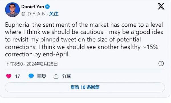 对于BTC 突破6 万之后的走势,Matrixport 共同创办人Daniel Yan 前(28)日也在X 发文表示,目前的市场情绪已经达到了他认为应该保持谨慎的水平,且他认为在4 月底,也就是比特币减半发生后不久,BTC 会出现一个15% 的健康回调。
