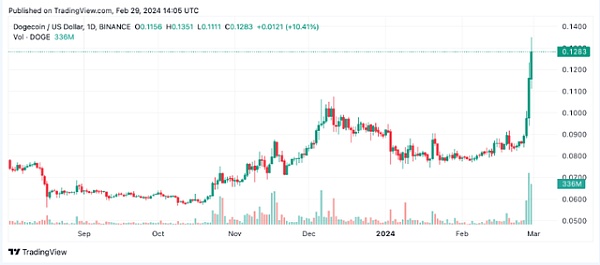 过去24小时对于狗狗币(DOGE)、柴犬币(SHIB)和Bonk(BONK)来说就是这样。截至周四(2月29日),模因代币总价值达到了342.2亿美元。总体而言,模因币经济在过去一天上涨了24.7%。市值最大的模因币狗狗币(DOGE)接近0.13美元的标志,并且市值达到了183.2亿美元。