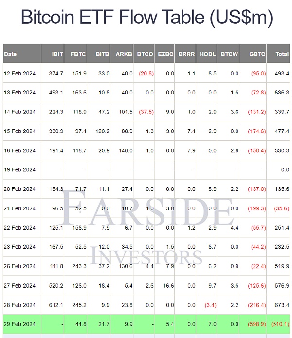 据Farside Investors称,2月29日,GBTC净流出5.99亿美元,这是自1月11日推出以来的第二大流出。