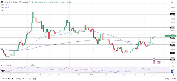14天RSI读数为65.24,表明瑞波币在进入超买区域之前回到0.60美元关口。