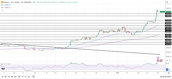 周三,比特币现货ETF市场净流入升至6.734亿美元的历史新高。贝莱德iShares Bitcoin Trust(IBIT)的净流入量从2月27日的5.202亿美元,增加到2月28日的6.121亿美元。